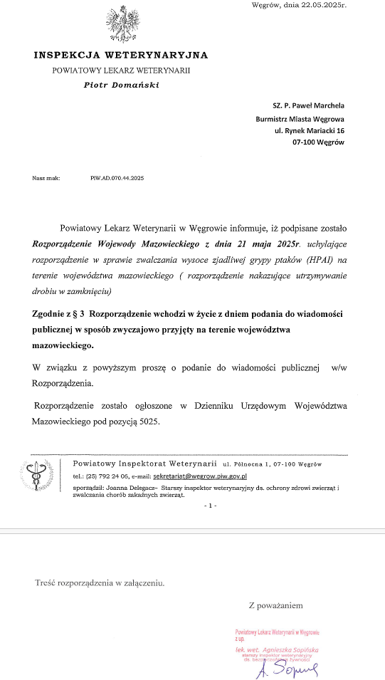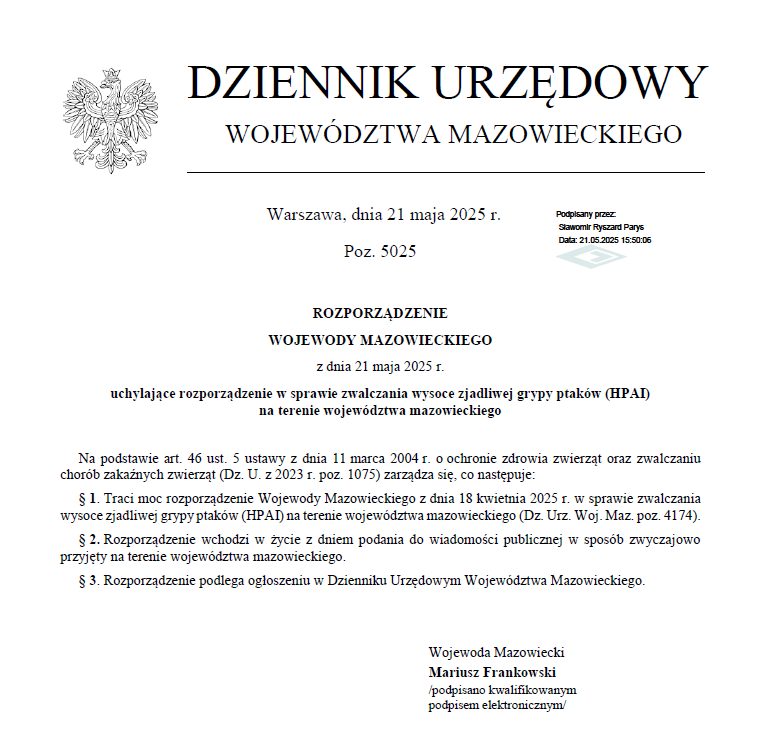 Rozporządzenie Wojewody Mazowieckiego dot. zwalczania wysoce zjadliwej grypy ptaków |